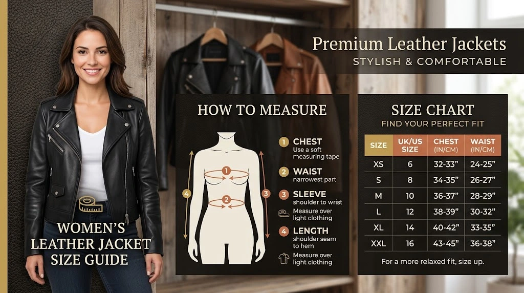 Always follow a women leather jacket size guide carefully. Start with Shoulder Fitting because this decides the overall look. Then check Sleeves Length, Chest Fit, and Waist Fit. If the shoulders fit well, the whole jacket naturally looks more polished.