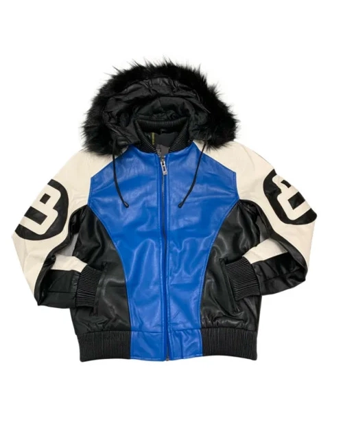 Buy 8 Ball Black White and Blue PU Fur Hooded Parka Leather Jacket On Sale