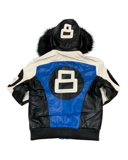 The 8 Ball Black White and Blue Parka Leather Jacket is a timeless piece showcasing 19s vintage streetwear fashion and the popularity of the renowned game, 8-ball pool. The jacket is known for its bold color blocking and the famous 8-ball pool logo on the back of the jacket, sleeves, and back of the hood, which gives the jacket a timeless and stylish aesthetic.