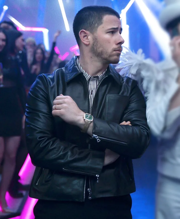 Nick Jonas A Very Jonas Christmas Movie 2025 Black Leather Jacket