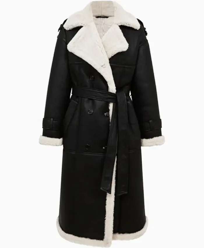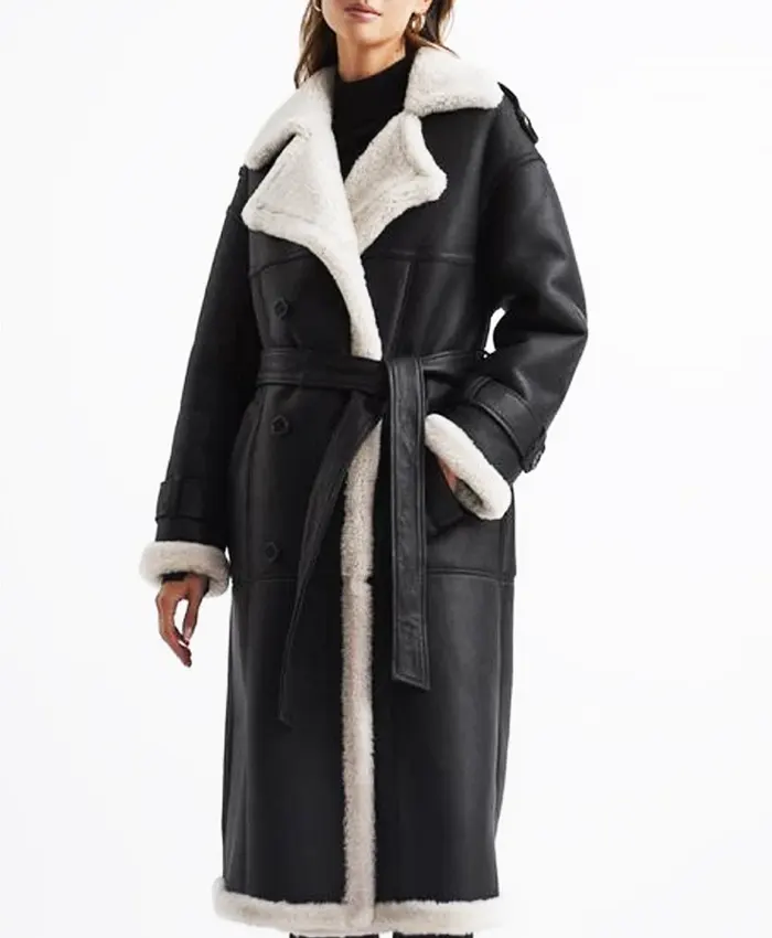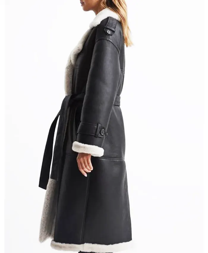 Aida Shearling Leather Double Breasted Buttoned And Belted Closure Black Coat For Women’s