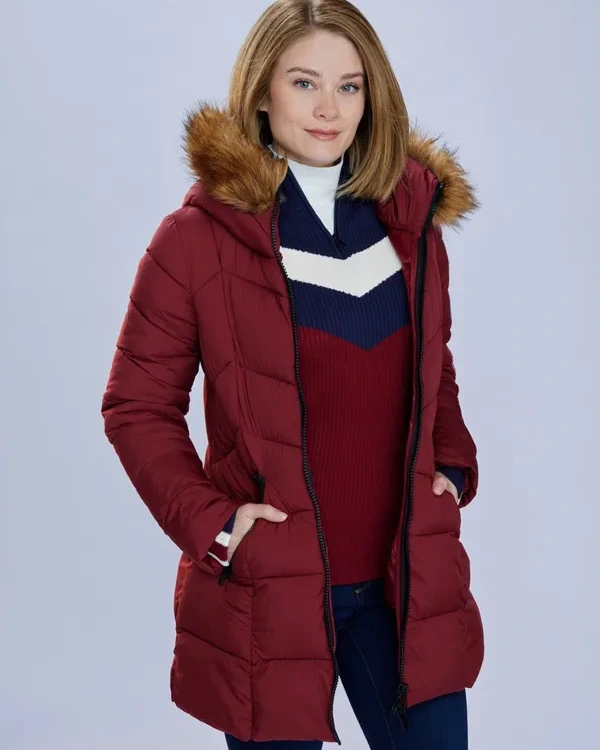 Kim Matula Movie The Finnish Line 2024 Anya Maroon Shearling Hooded Jacket