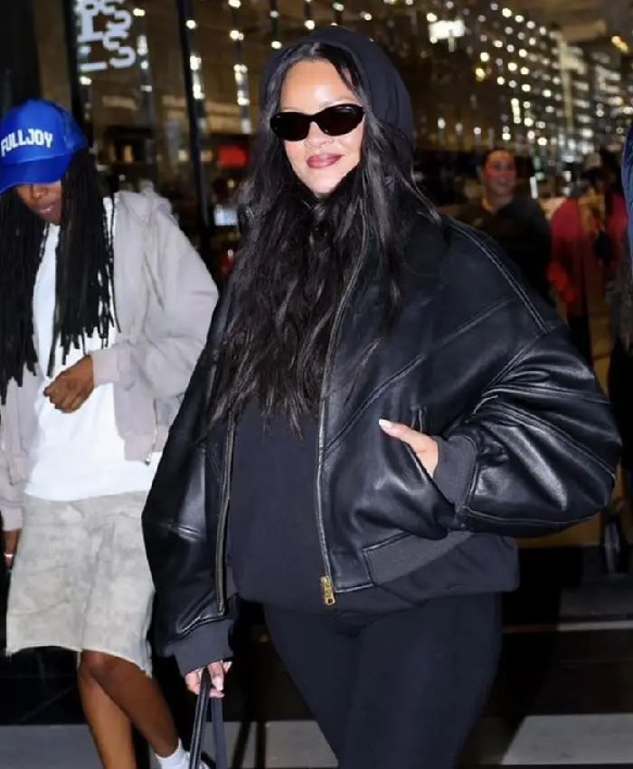 Rihanna Arab Fashion Week 2026 Black Oversized Bomber Leather Jacket For Women