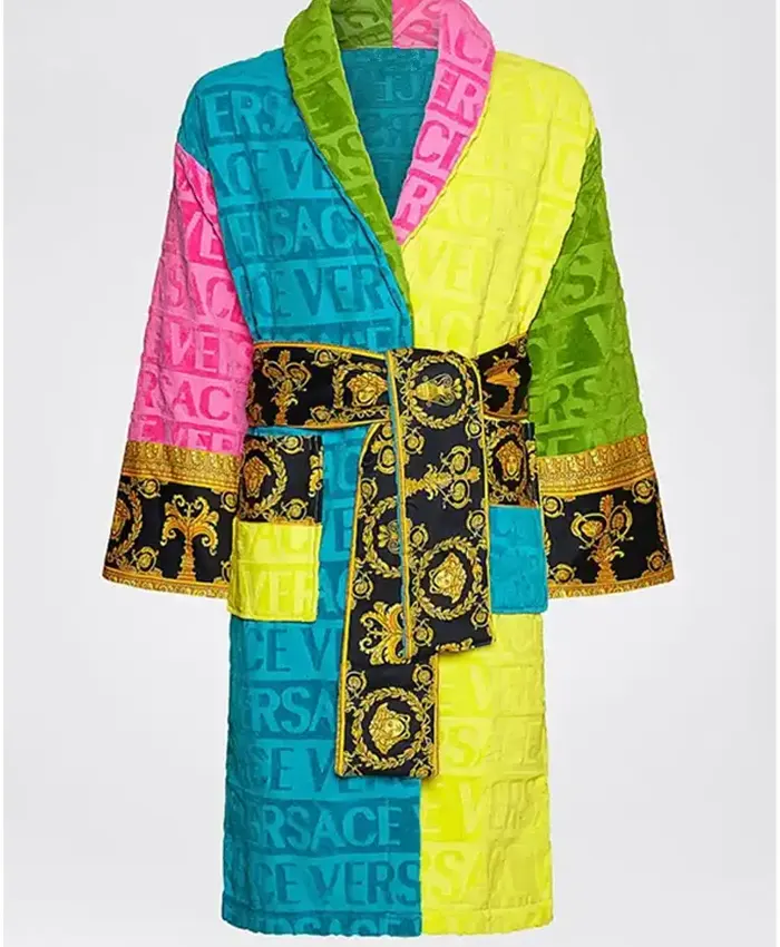 The Ari Haley Rich In Color Versace Bath Robe is all about comfort blended with eye-catching style. It is fabricated from soft terry material, which feels warm plus plush. Moreover, it has an inner smooth viscose lining that adds extra comfort, making it perfect for relaxing at home. Apart from that, the multi-color design gives it a rich plus lively look, so you feel stylish.