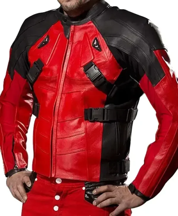 Armored Red & Black Deadpool Biker Jacket – Bold Leather Marvel Style