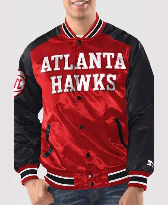 Step into the spirit of American basketball with the Atlanta Hawks Red and Black Varsity Bomber Jacket, a true blend of vintage charm and modern style. Made from premium satin fabric in bold red and black, this jacket embodies the legacy and pride of the Hawks. The rib-knitted collar, cuffs, and waistband add a classic touch while ensuring a comfortable fit that stays true to retro-inspired design.