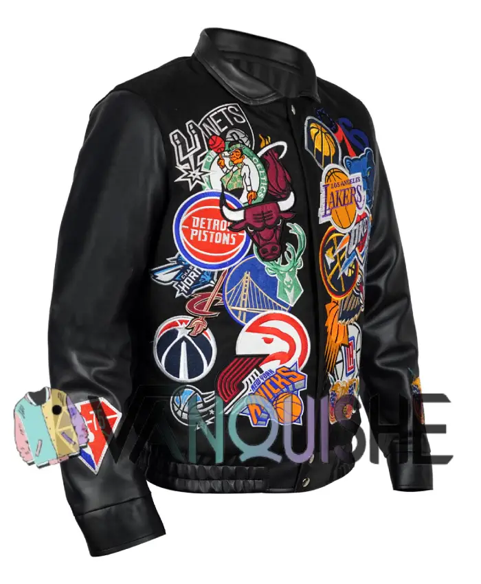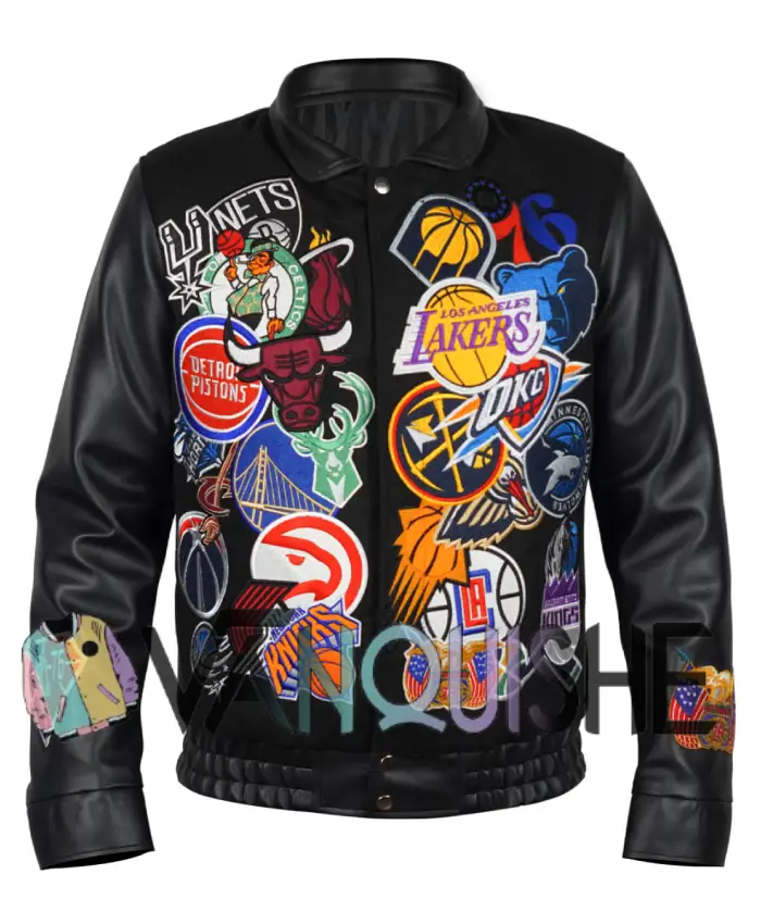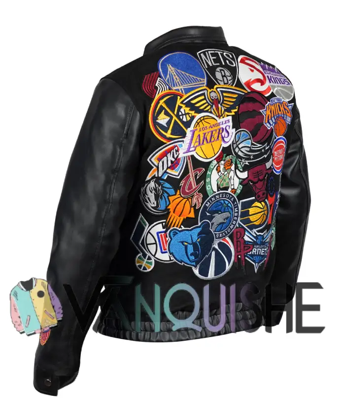 The action-packed Basketball Megapatch Wool Leather Black Jacket is the ultimate example of an athletic culture. Inspired by basketball’s rich history and old-school varsity jackets, the Basketball Megapatch Wool Leather Black jacket is ideal for those looking to combine their fandom with style! The many dynamic mega patch logos add vibrancy to the casual ‘everyday’ look of the wearer.