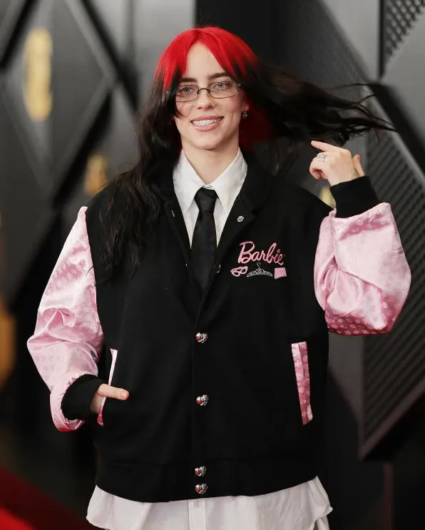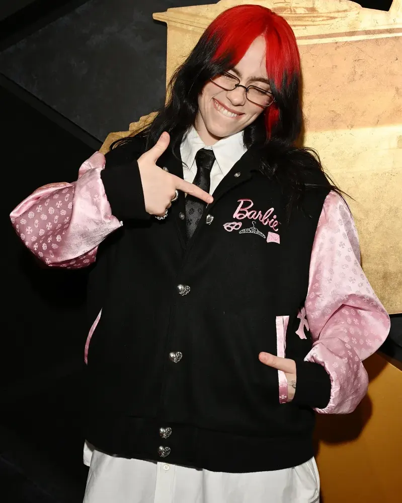Get Billie Eilish Grammy Awards 2024 Vintage Barbie Varsity Bomber Jacket On Sale