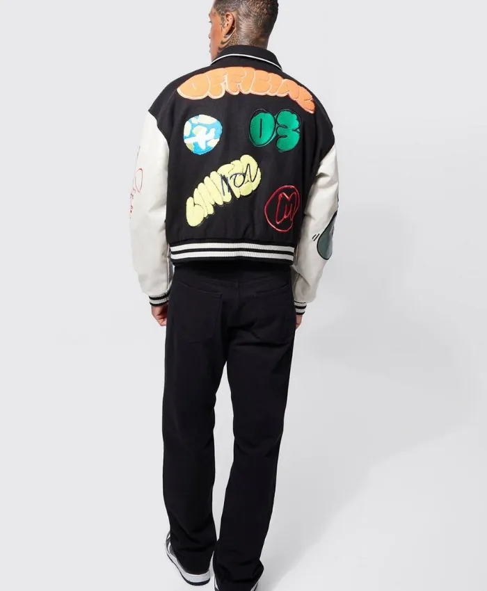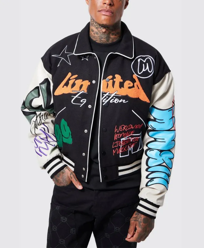 The Black Boxy Fit Graffiti Varsity Jacket is a stylish outerwear piece that blends streetwear style with classic varsity elements. Its premium wool fabric, relaxed boxy fit, and graffiti-inspired design offer comfort, durability, and trendsetting fashion, making it suitable for both street and casual outfits.