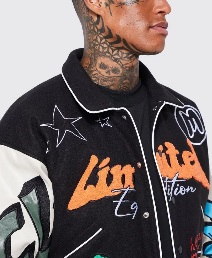 This winter season, head out with confidence in our Black Boxy Fit Graffiti Varsity Jacket. This jacket is unique and bold streetwear, combining graffiti-inspired design elements with classical varsity design.
