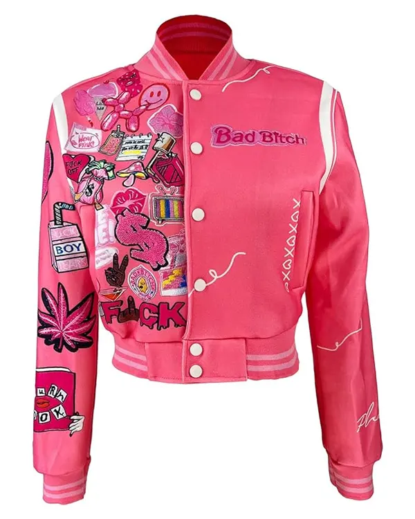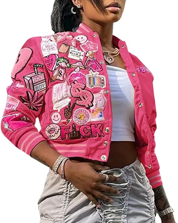 Burn Book Pink Mean Girls Wool Fabric Crop Varsity Bomber Jacket