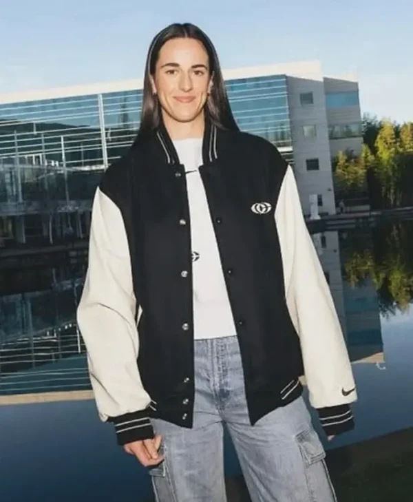 Shop Caitlin Clark x Nike 2026 Black and White Wool Leather Varsity Jacket For Womens