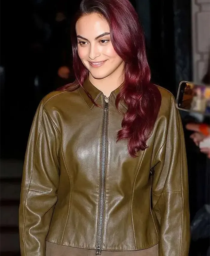 Get the Camila Mendes SNL 2025 Olive Green Leather Jacket Add to Cart Today