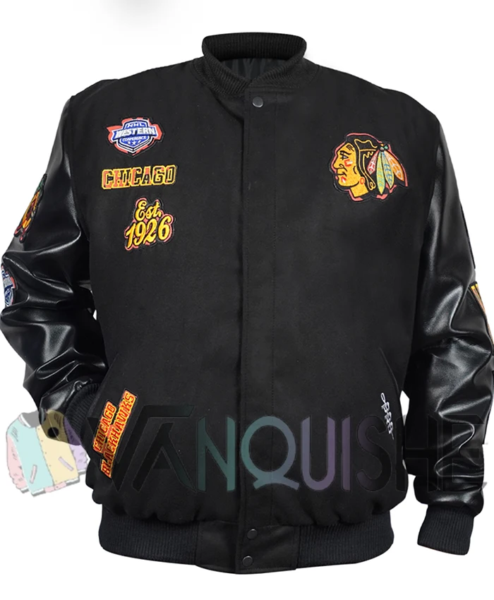 Chicago Blackhawks Hockey Team Style 2025 Team Patch Design Black Wool & Leather Varsity Jacket Mens and Womens
