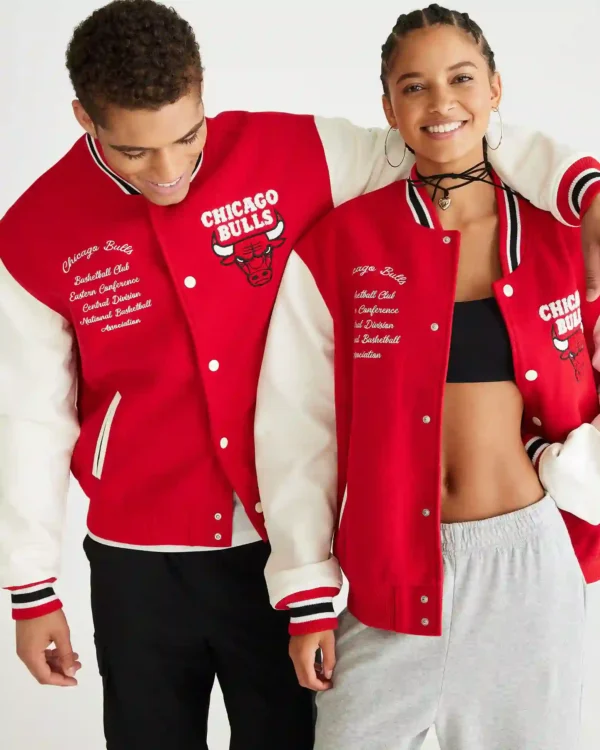 Chicago Bulls NBA X Aeropostale PU Leather Sleeves Varsity Bomber Jacket For Men and Women