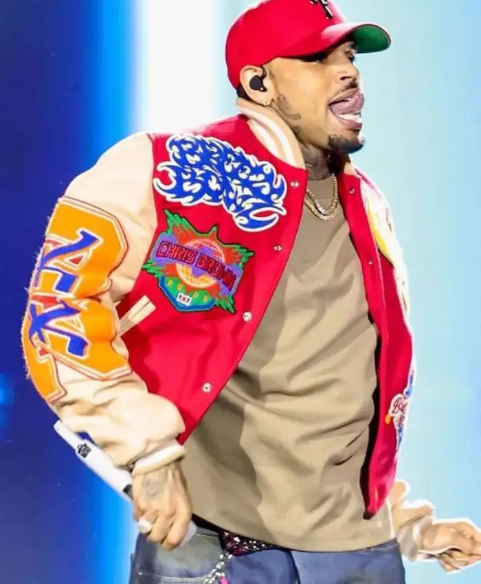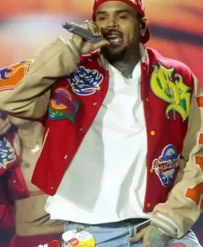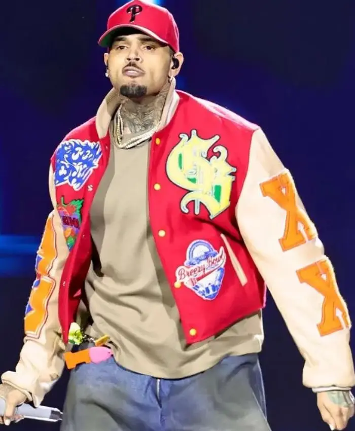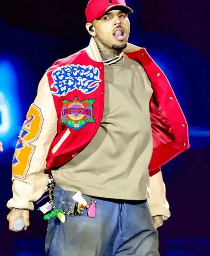 Chris Brown Breezy Bowl XX Tour 2025 Breezy Stage Look Red & Beige Wool Leather Varsity Jacket