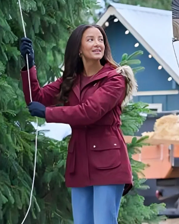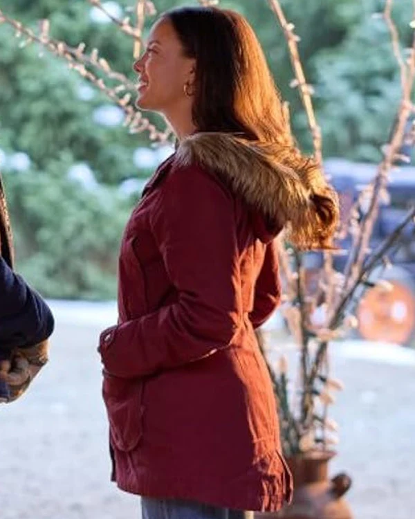Emily Movie Christmas Under the Lights 2024 Heather Hemmens Maroon Fur Hooded Jacket