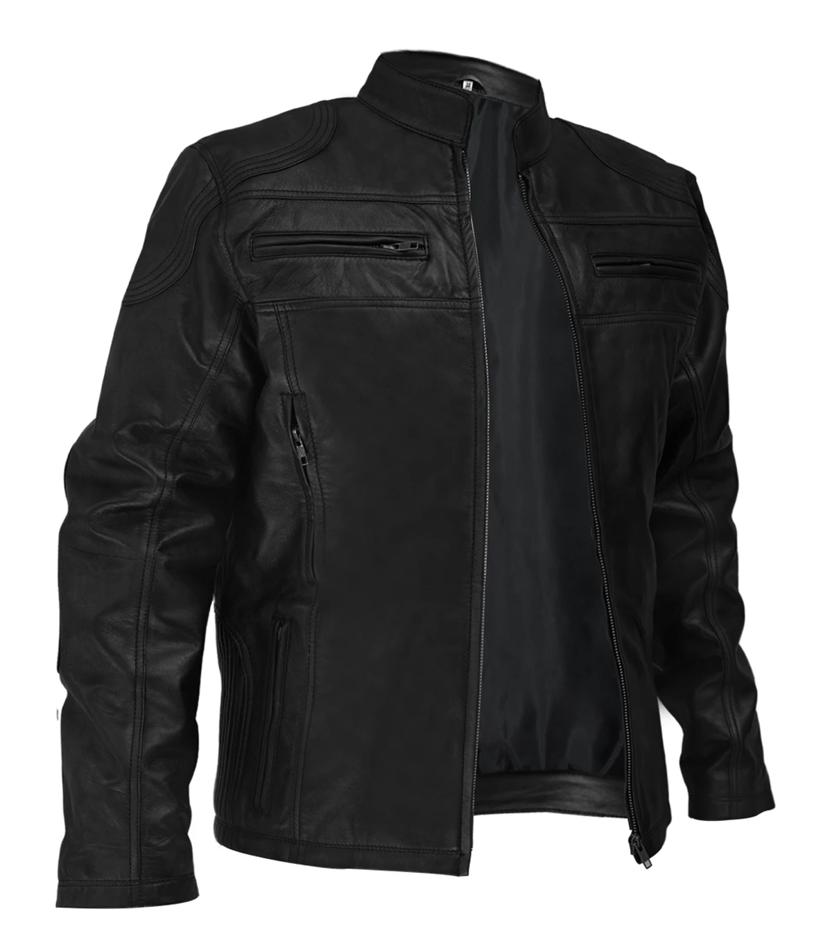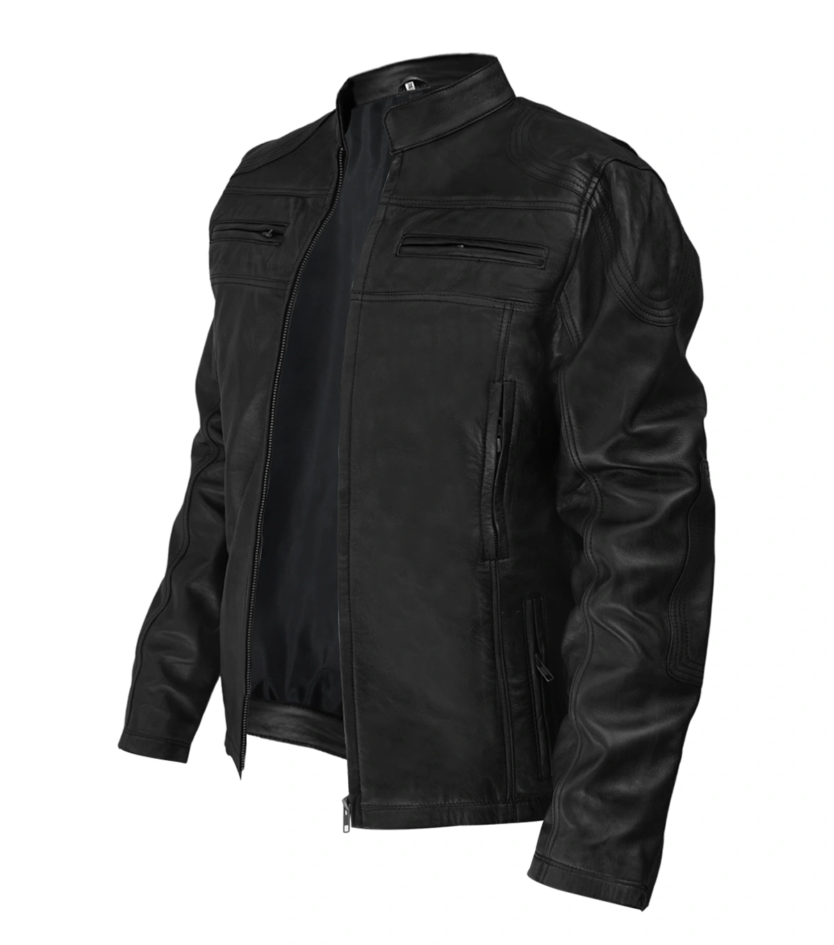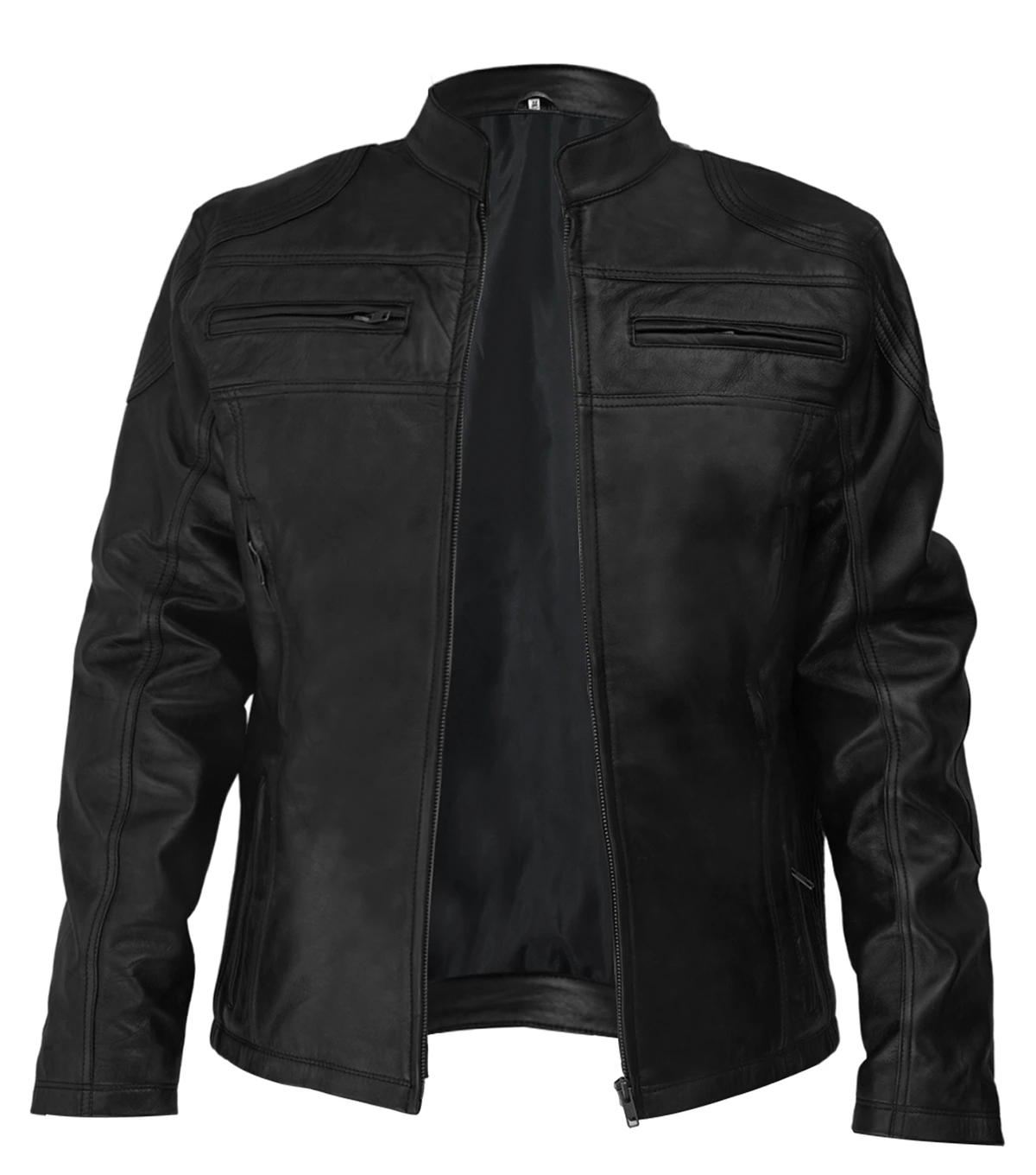 Buy Classic Black Leather Motorcycle Zipper Jacket on Sale