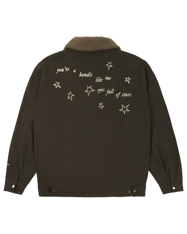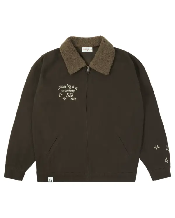 This Taylor Swift Cowboy Like Me Work Jacket also includes unique embroidered details that add a personal touch. Lyrics from the song “You’re a cowboy like me” are embroidered on the front chest, while “You’re a bandit like me, eyes full of stars” adorns the back, making it a standout piece for any Swiftie’s collection.