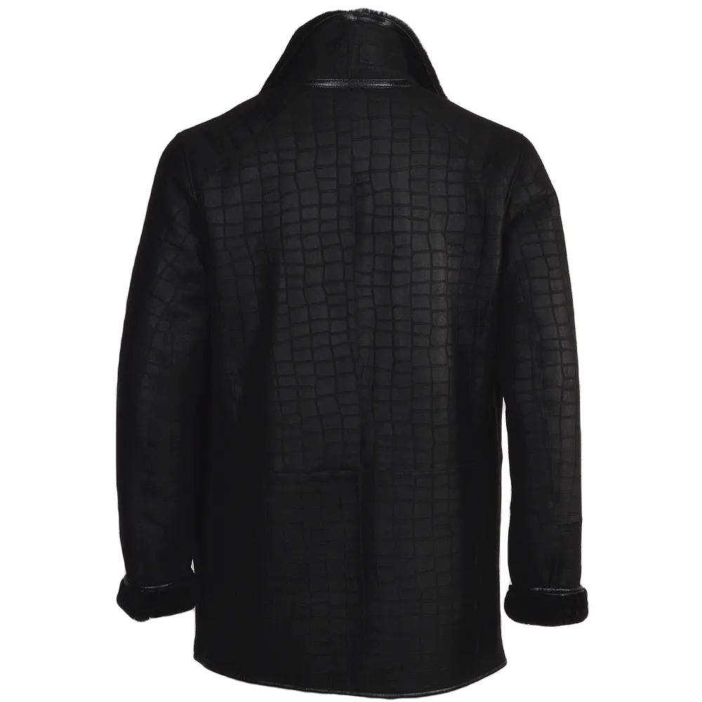 Mens Crocodile Pattern All Black Fur Genuine Leather Jacket