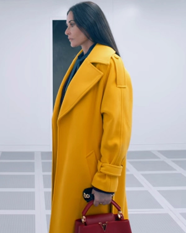 Demi Moore’s character in The Substance, Elisabeth Sparkle, is a fading Hollywood star navigating the complexities of identity and relevance. The film, directed by Coralie Fargeat, is a body horror narrative that explores themes of self-duplication and the pressures of maintaining youth in a superficial industry. Throughout the film, Moore’s character dons a striking yellow wool trench coat, which has become iconic in its own right.