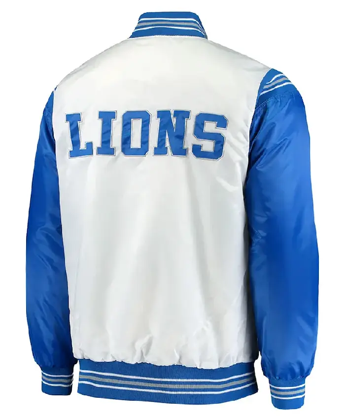Detroit Lions Historic Logo Renegade White and Blue Satin Varsity Jacket For Men and Women