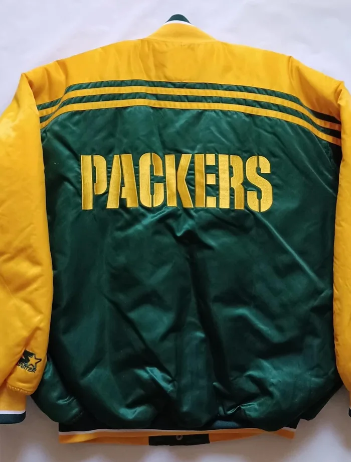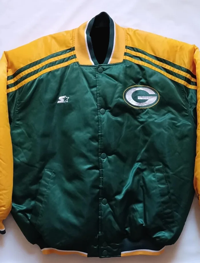 Good satin has a certain kind of glow to it. The Vintage Green Bay Packers Starter Jacket uses quality satin that catches light perfectly. It shines but never looks too flashy or cheap at all. The viscose lining feels smooth against your arms all day long. No scratchy seams or rough spots will bother you here. An OVO x Packers collab style piece is perfect for game days and tailgates. Yellow and green are the classic Packers colors that every true fan loves.