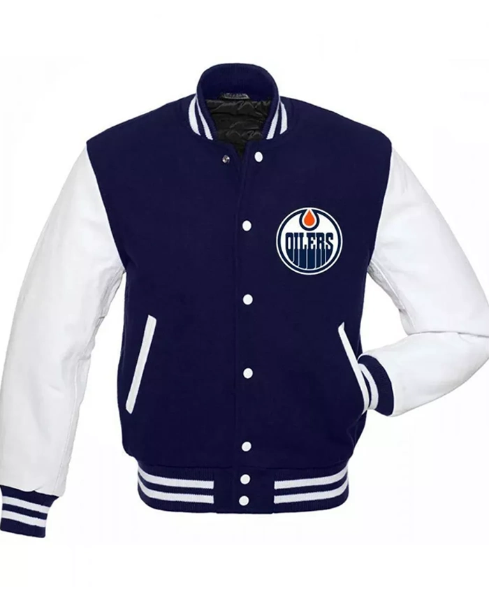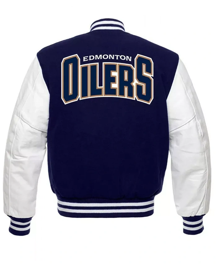 Edmonton Oilers Letterman Blue and White Jacket For Men and Women
