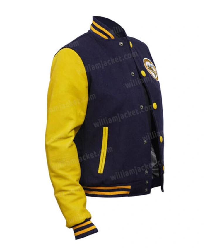 Design-wise, the jacket stands out with its vibrant blue and yellow colors true to what Ella wore onscreen. It includes two outer pockets for keeping your essentials secure or simply warming up your hands. The ribbed collar and cuffs add structure and style, while the button-up front provides a clean finish. Full-length sleeves round out the design, offering extra coverage and comfort. This varsity jacket is your chance to bring home a piece of Yellowjackets fashion functional, stylish, and straight from the screen. Grab this under the Yellowjackets Jackets and Coats collection at an affordable price.