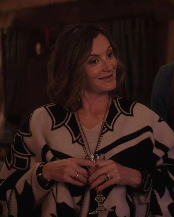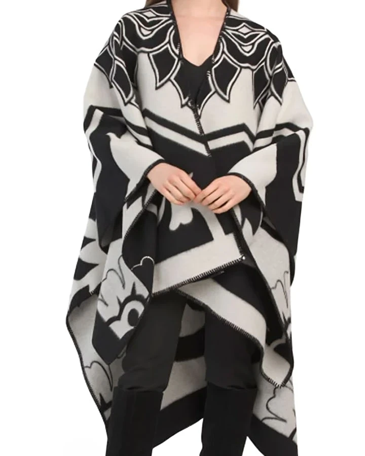 The Louise Emily In Paris S04 Camille Japy Printed Wool Cape Coat represents luxurious Parisian flair. This cape coat, which is made of premium wool, offers an attractive presence and provides warmth. A touch of classic elegance is added to your wardrobe with its stunning black-and-white color combination and complex printed design.