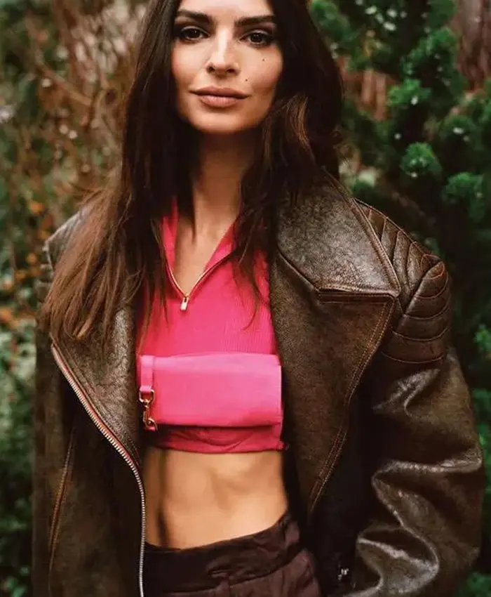 Discover the Emily Ratajkowski Brown Distressed Leather Jacket Vintage Streetwear Style