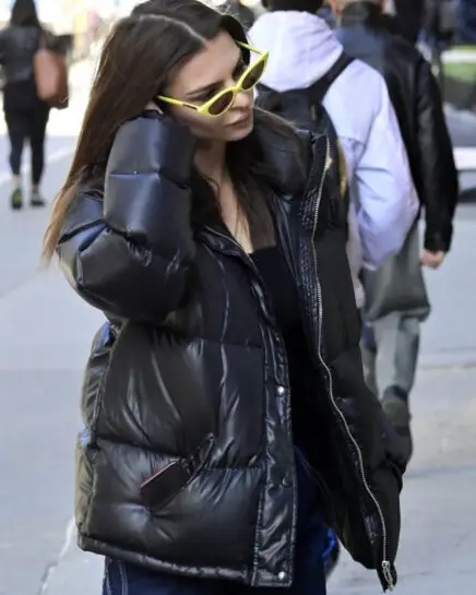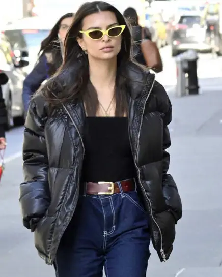Get Amazing Emily Ratajkowski Black Puffer Leather Jacket On Sale