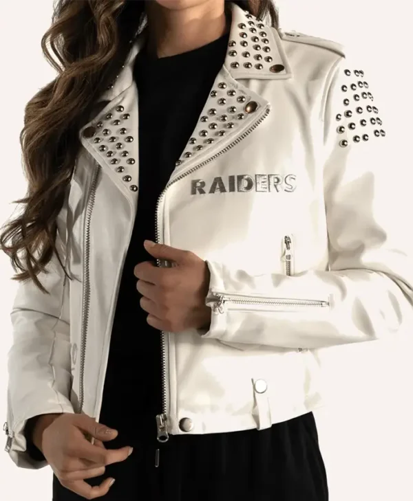 Eunice Abbott Las Vegas Raiders Biker Leather Jacket For Sale