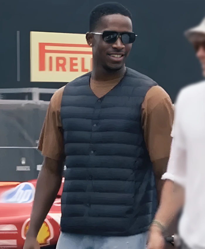 Damson Idris F1 The Movie 2025 Joshua Pearce Blue Puffer Vest