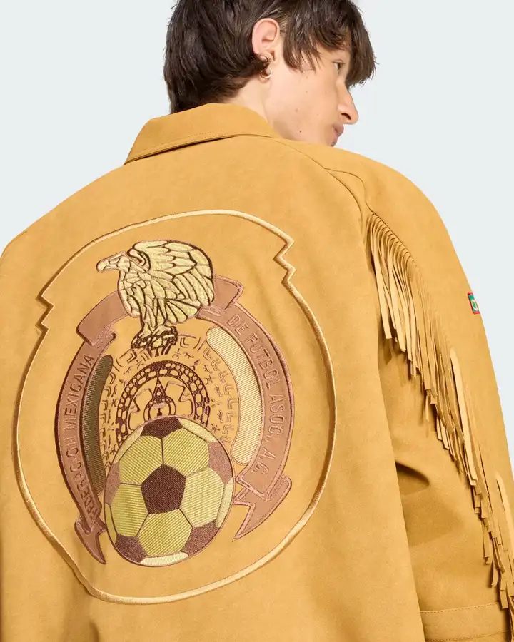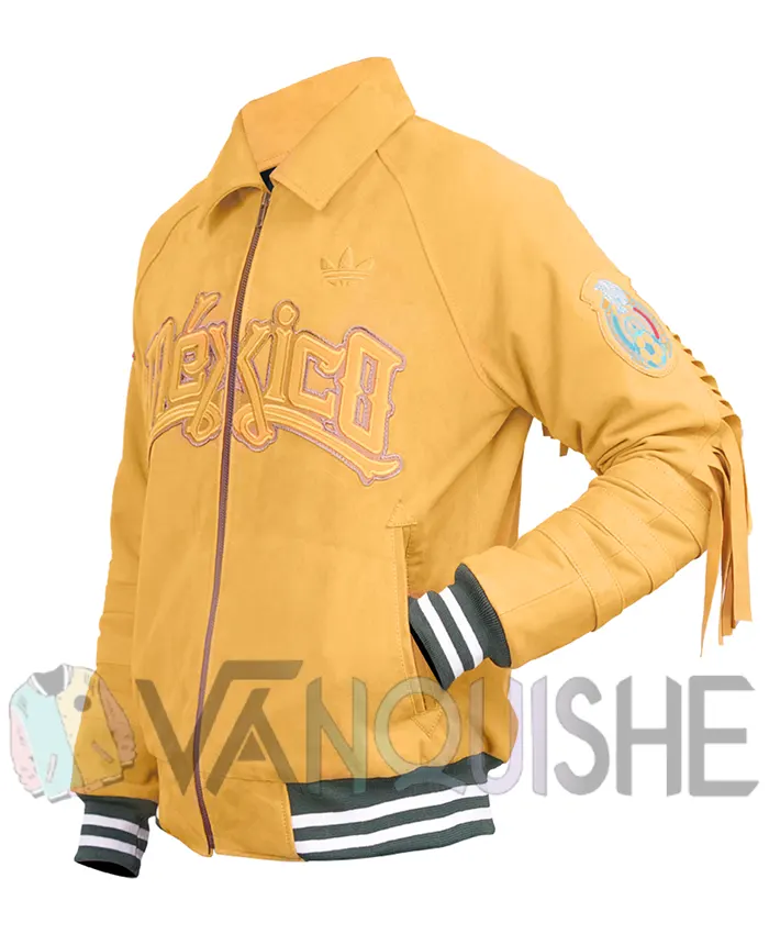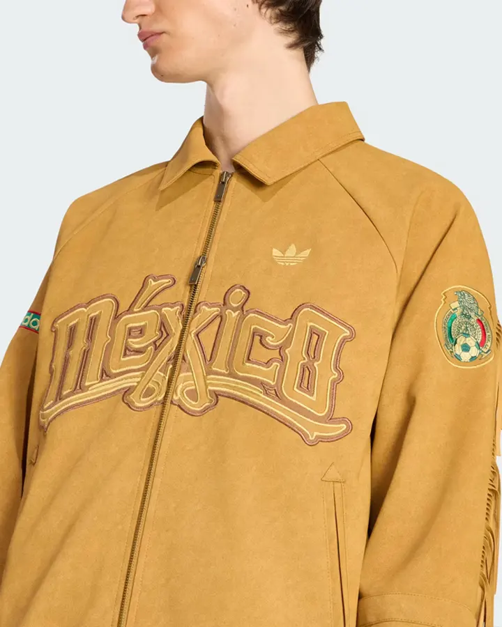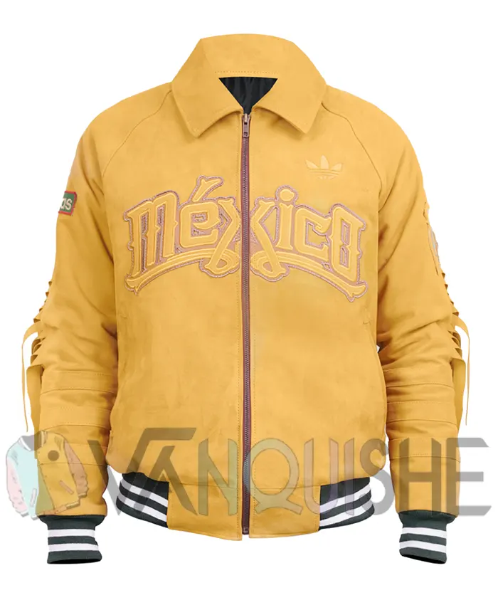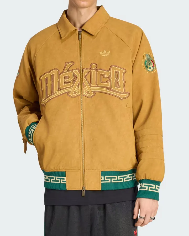 This jacket is a bright mustard color that stands out right away, just like Mexico’s fierce attitude toward football. The Adidas x Mexico FIFA World Cup 2026 Jacket is fabricated from suede leather or cotton with embroidery, which makes it look high-end and sporty at the same time. The cotton lining on the inside keeps things cool and comfy, so you can wear it for hours and still feel good. It’s great for cooler nights because the long sleeves and ribbed cuffs keep you warm and give the shirt shape.