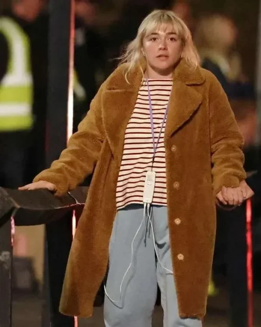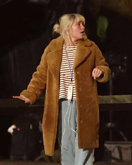 Almut We live in Time 2025 Florence Pugh Brown Shearling Long Coat On Sale