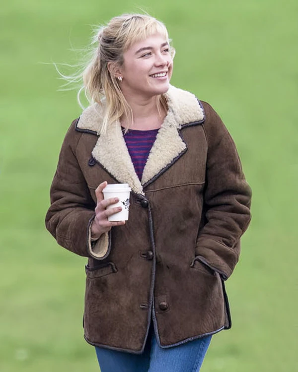 Florence Pugh Movie We Live in Time 2025 Almut Brown Shearling Jacket On Sale