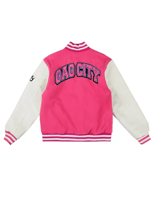 Gag City Pink and White Wool Varsity Bomber Jacket