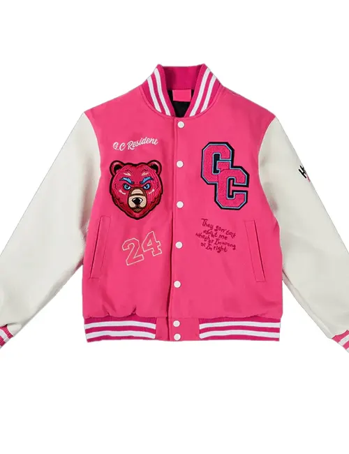 Those who like to stand out will love the fashionable and practical Gag City Pink and White Wool Varsity Bomber Jacket. This jacket is a great option for sporting activities or informal get-togethers since it blends comfort and style.