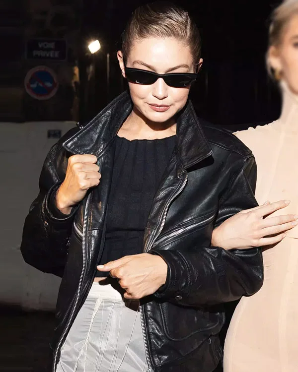 American Model Gigi Hadid Paris Fashion Week 2024 Black Leather Jacket For Sale