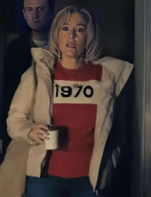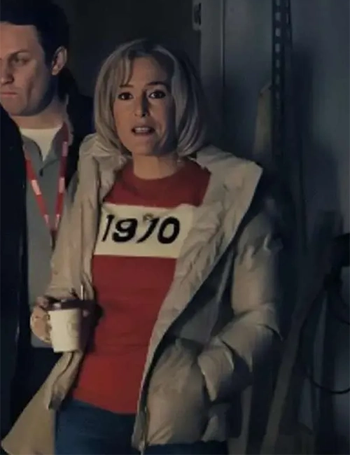Gillian Anderson Movie Scoop 2024 Emily Maitlis Beige Puffer Jacket