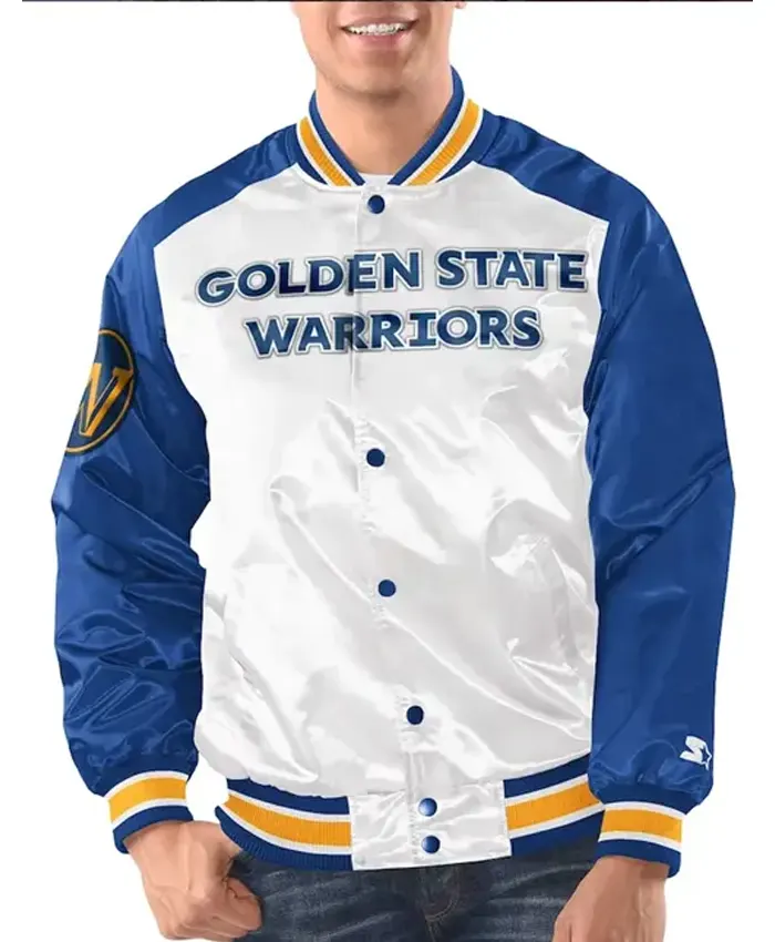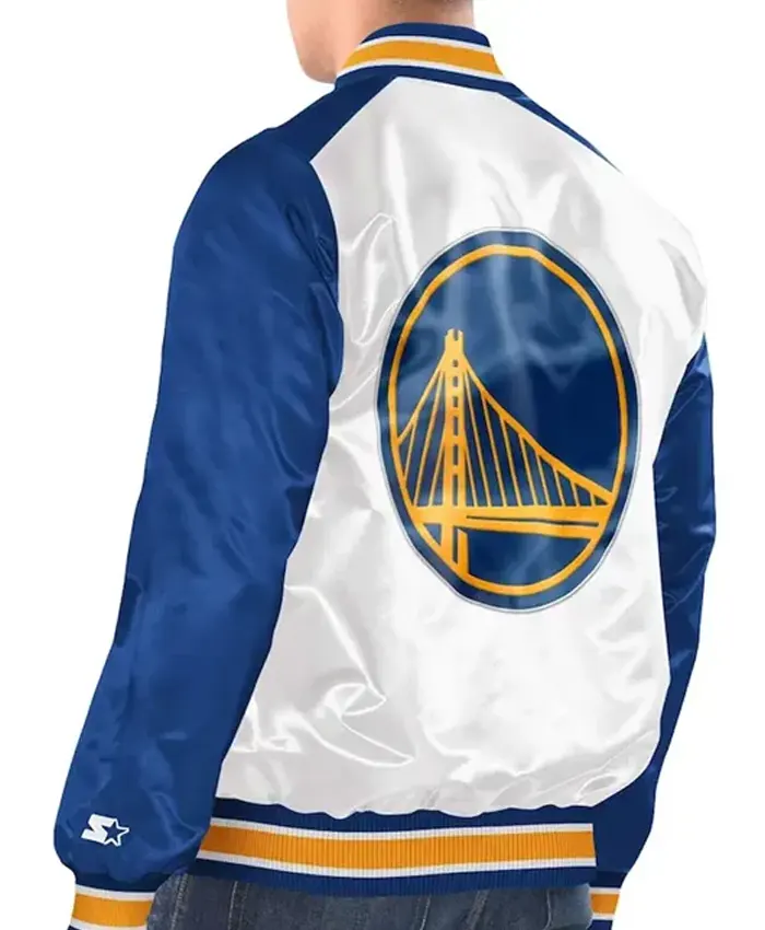 Golden State Warriors Renegade White/Royal Satin Varsity Letterman Jacket