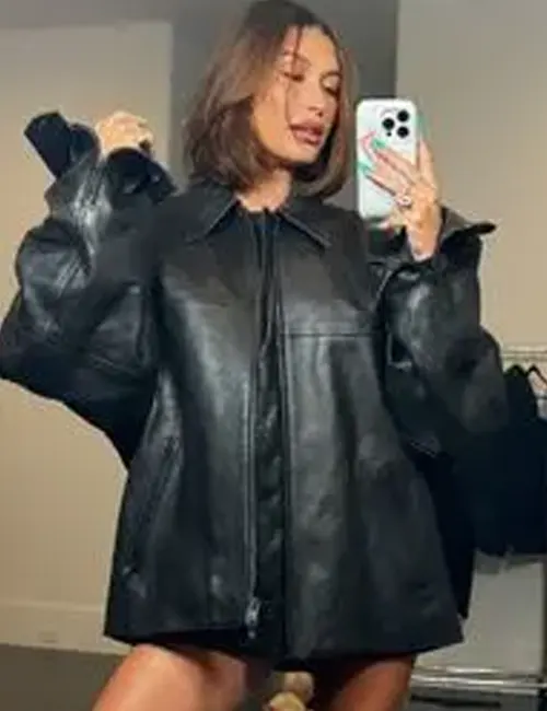 Be the first to review “Hailey Bieber Coachella 2024 Black Oversize Bomber Jacket” Cancel reply