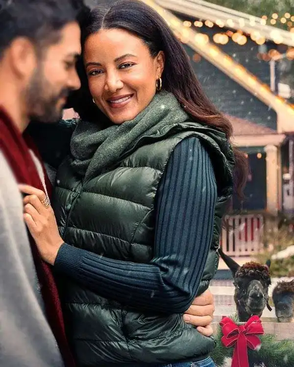 Emily Movie Christmas Under the Lights 2024 Heather Hemmens Green Puffer Hooded Vest