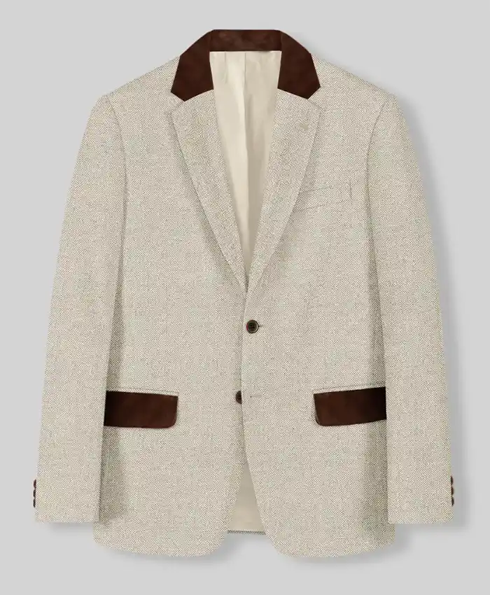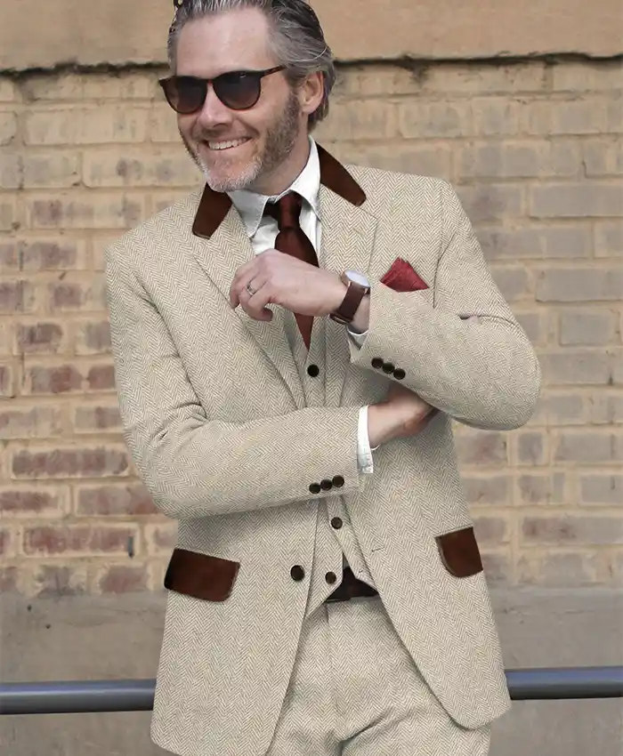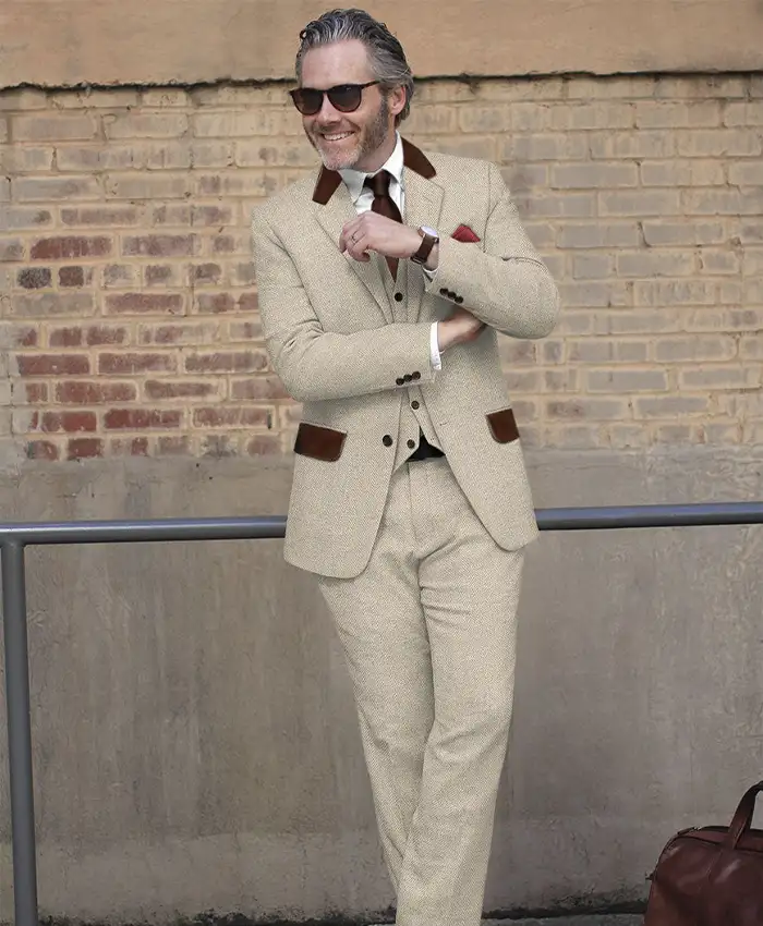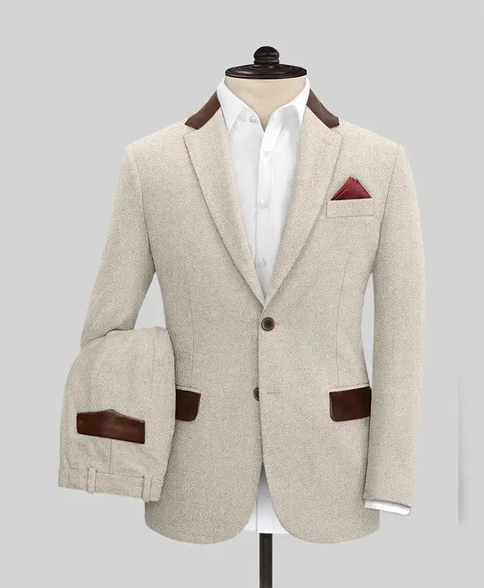 Herringbone Beige Tweed Suit For Mens Wedding And Events With Leather Trims