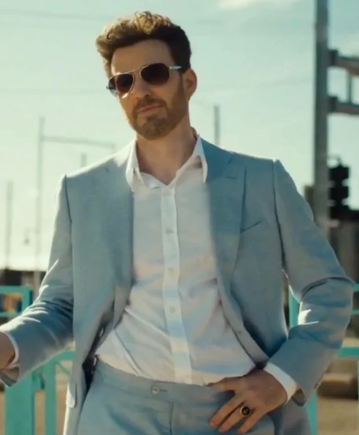 Chris Evans Movie Honey Don’t! 2025 Reverend Drew Blue Blazer