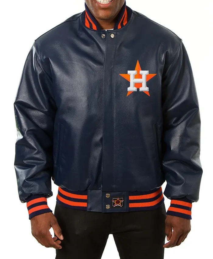 Houston Astros Navy Blue Leather Bomber Jacket For Sale