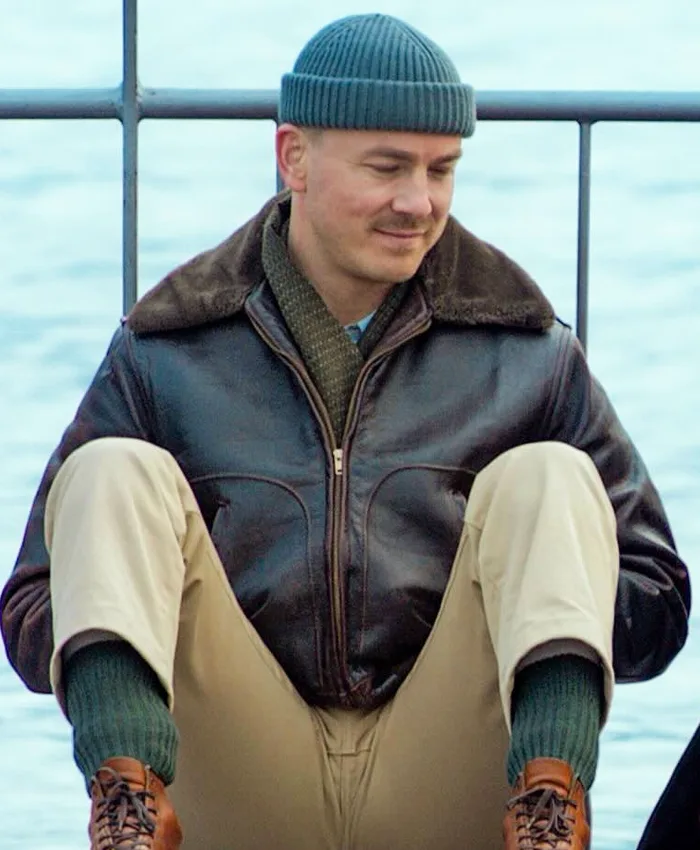 James Larkin White Movie I’m Not Stiller 2025 Albrecht Schuch Black Shearling Leather Jacket