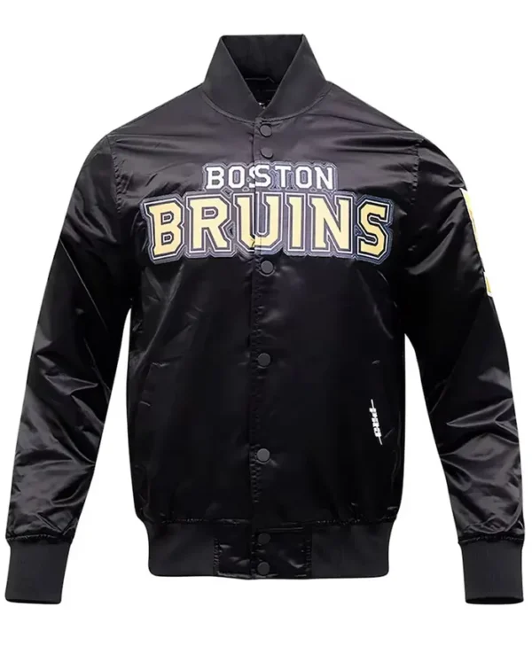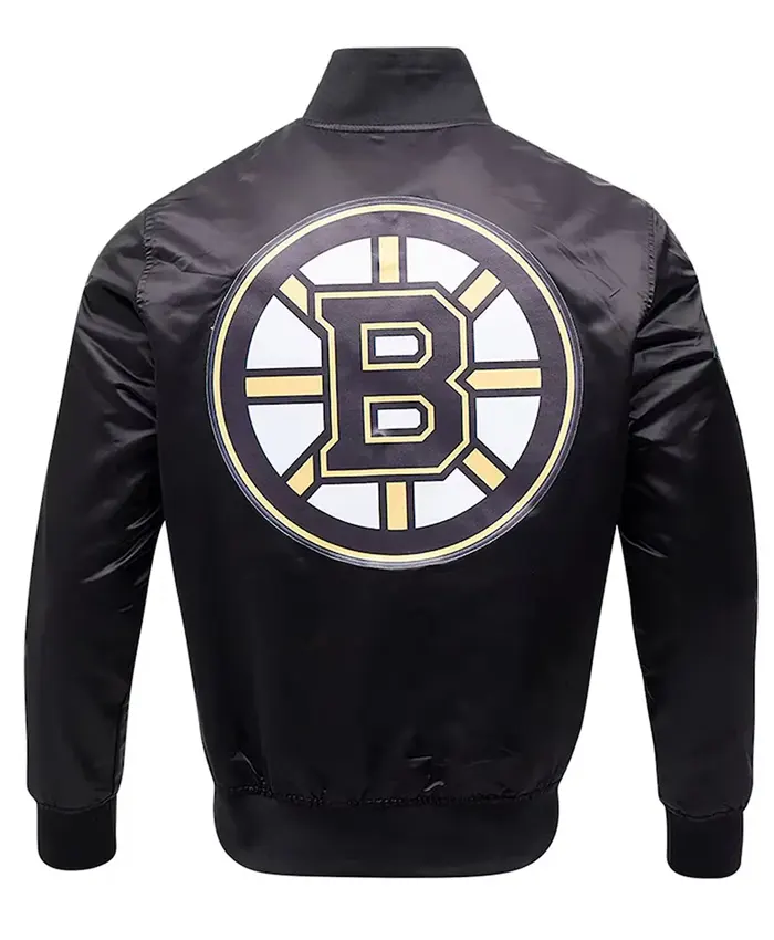 Irwin NHL Boston Bruins Glam Black Satin Varsity Bomber Jacket