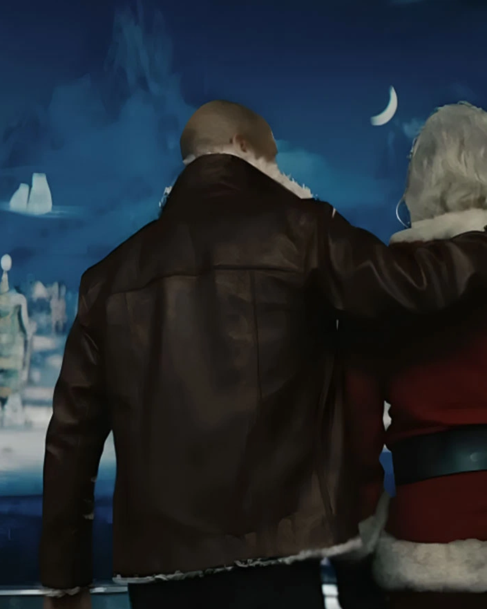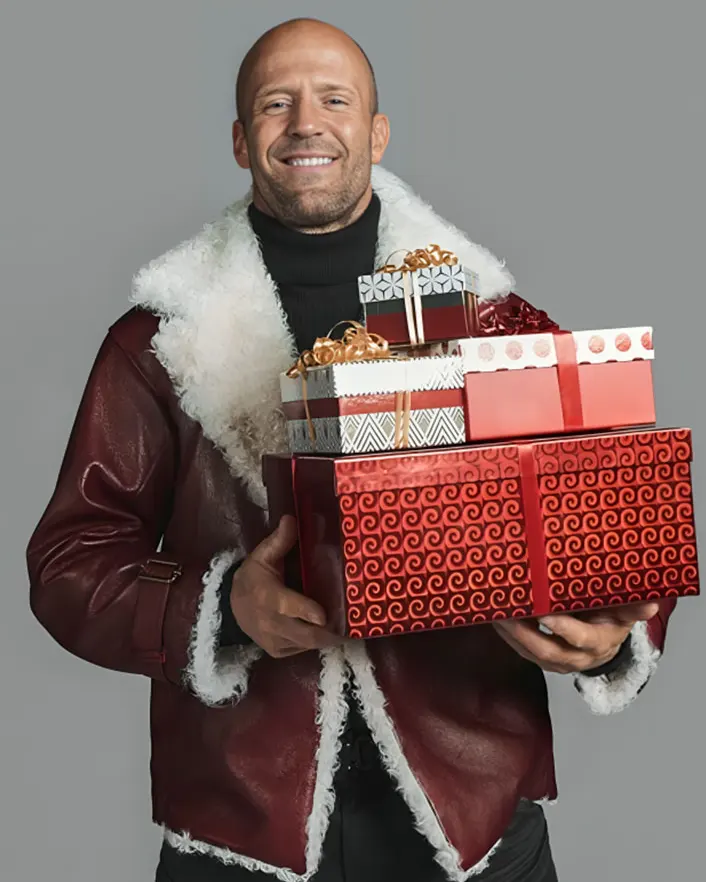 Jason Statham Takes On Holiday Ops Red and White Shearling Leather Jacket